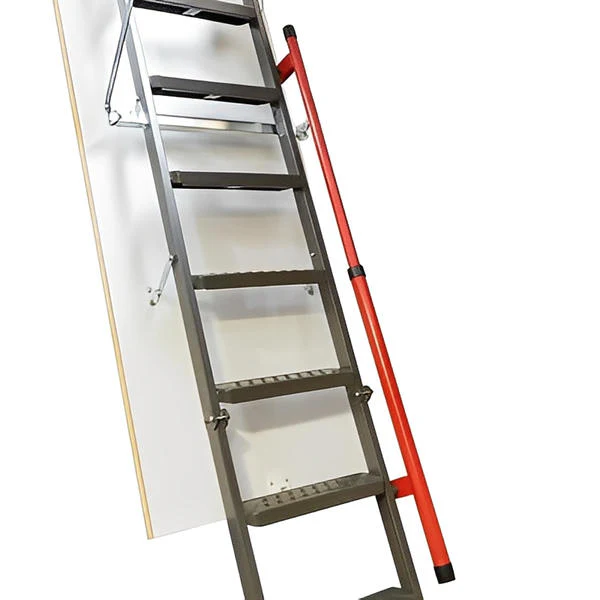 The LMP is a metal, 3-section folding attic ladder, designed for high spaces, up to 12 ft. It contains an unloading mechanism, hidden in the handrail that supports the folding and unfolding of the ladder. Its solid metal body is strong enough to hold 350 lbs.
